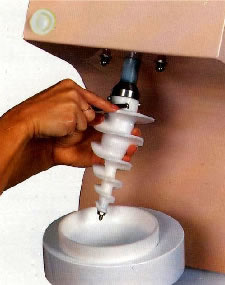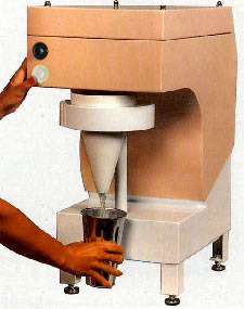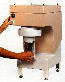 In most cases, you can blend different flavors one after the other as very little residue is left on the auger and in the mixing bowl. However, in some cases between strong flavors, a simple rinse is done by holding a container of water under the mixing bowl while pressing the white button for approximately 3-4 seconds (Fig. 1). The water is sucked up into the bowl and runs out once the white button is released (Fig. 2).
